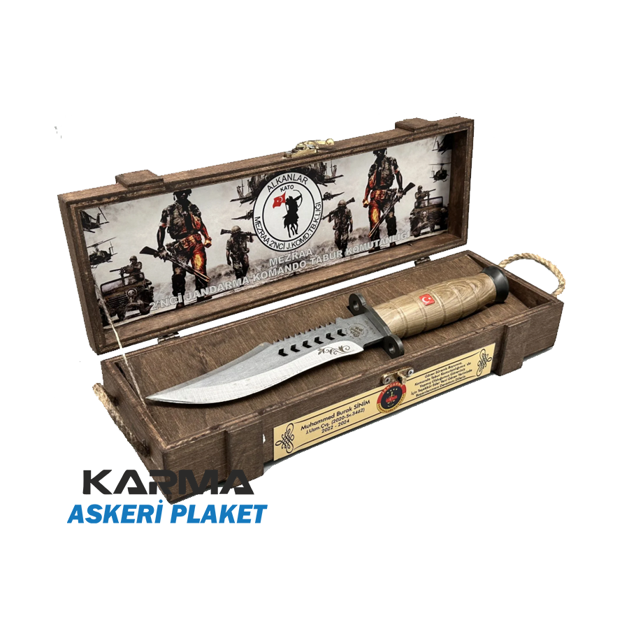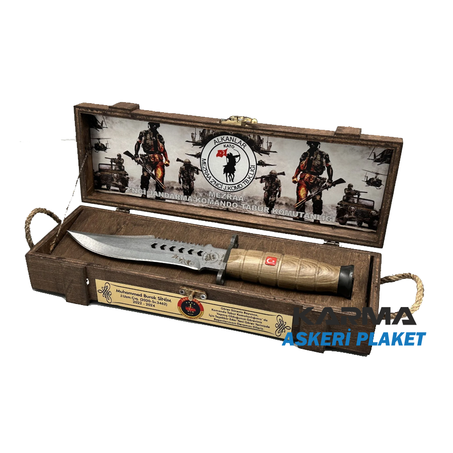 Özel misafirleriniz, yöneticileriniz, müşterileriniz için kişiye özel tasarlanabilen jandarma, uzman, komando piyade bıçakları özel olarak üretilen kadife kutuda.